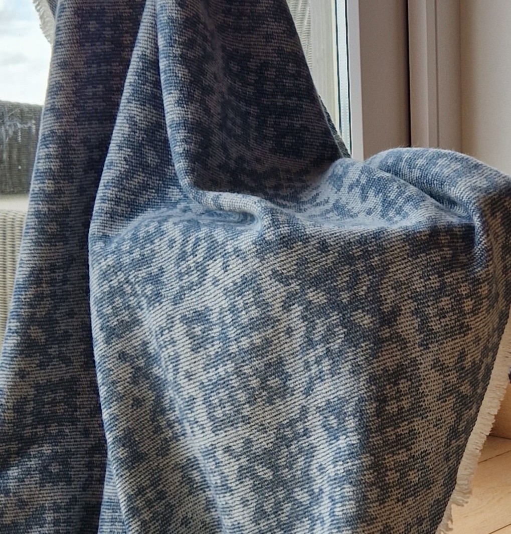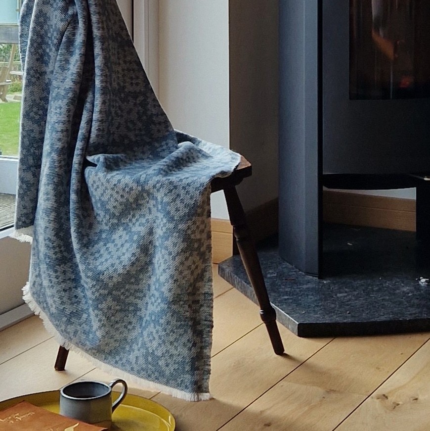 Comfort… to comfort… to be comforted… a comforter. A comforter is just what these smaller handwoven lambswool throws are. Its made for one. Something personal that you can throw across your knees on the sofa, in the office, or pub, restaurant, theatre… You could have a picnic on it. You could wrap it around your neck and tuck it into your favourite big coat on a really windy or wet journey. The North Star comforter is handwoven in lambswool in my studio in West Cornwall. This version comes in a beautiful teal blue.